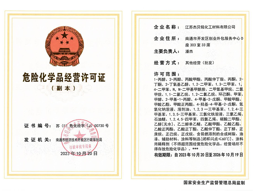 江苏杰贝铭化工材料有限公司是一家销售型的化工企业,酒精、白电油、乙酯、清洗剂、稀释剂畅销消费者市场,在消费者当中享有较高的地位,公司与多家零售商和代理商建立了长期稳定的合作关系。江苏杰贝铭化工材料有限公司经销的酒精、白电油、乙酯、清洗剂、稀释剂品种齐全、价格合理。江苏杰贝铭化工材料有限公司实力雄厚,重信用、守合同、保证产品质量,以多品种经营特色和薄利多销的原则,赢得了广大客户的信任。